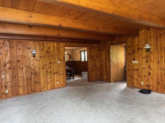Single family home located on 1.28 acres in the Village with 2 storage buildings.  This lot includes 152 ft of road frontage on Williams Ave that would be a prime building lot with access to Village utilities.  Enter this home into the foyer that includes a closet.  The spacious living room has beamed ceilings and tongue and groove walls.  Large windows let in lots of lights.  This home also includes a formal dining room, eat-in kitchen with an island and lots of cabinet and counter space.  A door from the kitchen leads to the rear covered deck with beautiful views of the private wooded back yard.  On the main floor you will also find a full bath.  Upstairs you will find 2 nice sized bedrooms and an office.  The garage is located under the home and offers lots of dry storage.