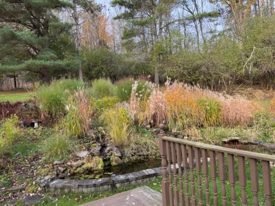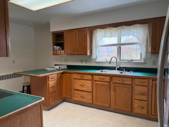Spacious home located on .84 acres with a circular blacktop driveway. This property overlooks the Village with a wooded lot behind the home, an above-ground swimming pool and storage building. Enter this home from the front deck into the foyer with a closet. A large picture window brightens the living room with a gas fireplace and hardwood floors. The formal dining area has French doors that open onto the back deck with views of the woods and coy pond with fountains and waterfalls. The eat-in kitchen includes a refrigerator, garbage disposal, dishwasher, electric cooktop and built-in oven and leads to the mudroom and side door. On the main floor you will also find the spacious primary bedroom, a second bedroom, a full bath with heated ceramic tile flooring, a walk-in ceramic tile shower and two hall closets. Upstairs you will find 2 additional bedrooms, an office and a full bath. The full basement includes a family room with a wet bar, workshop, storage room and a door that leads to the 1 car garage.